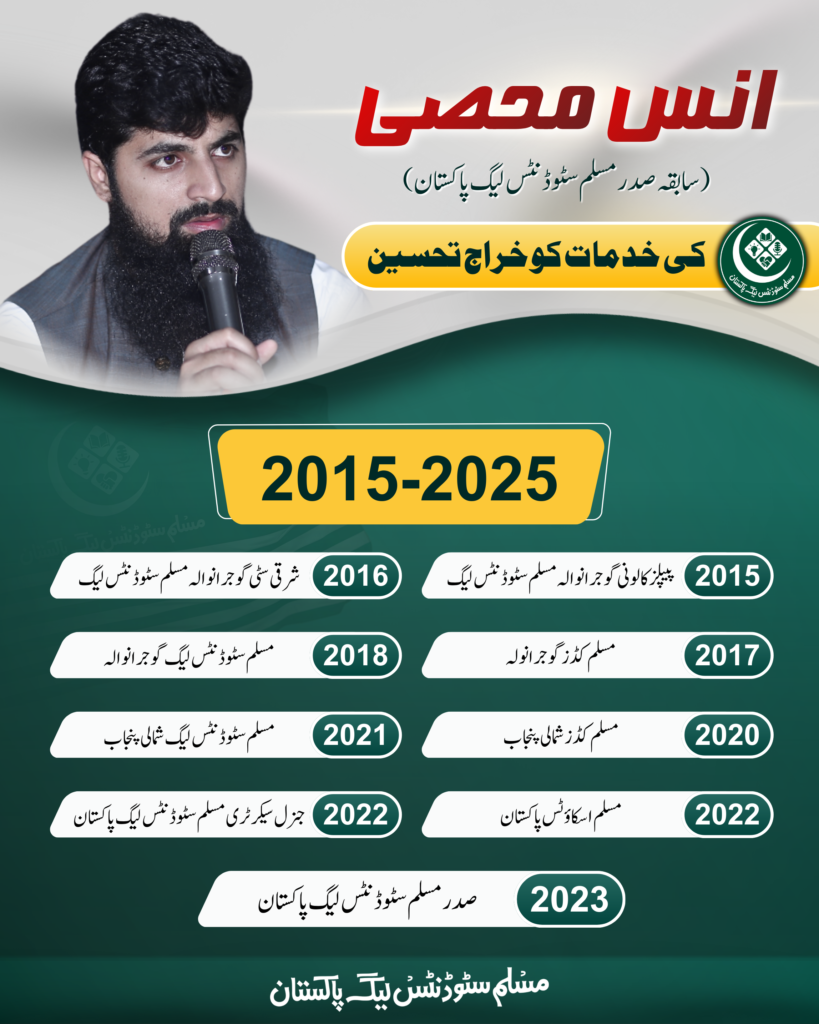 In 2023, he was entrusted with the role of President Muslim Students League Pakistan, where his leadership brought stability, vision, and renewed confidence.